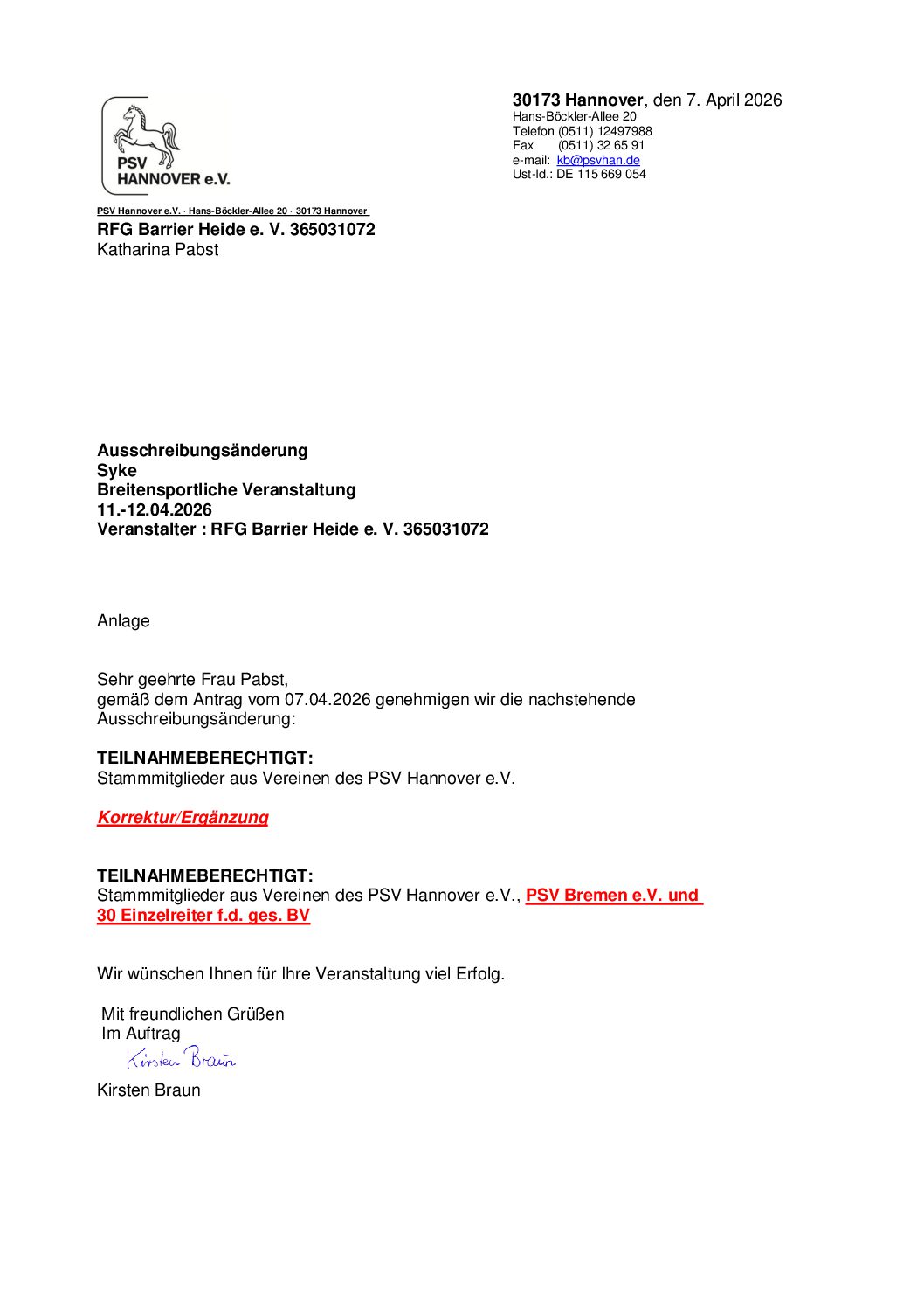 Unsere Ausschreibung wurde geändert! Nun können auch 30 Reiter aus dem PSV Bremen und 30 Reiter aus dem gesamten BV bei unserem Turnier nennen! Nutzt noch schnell die Gelegenheit!!
