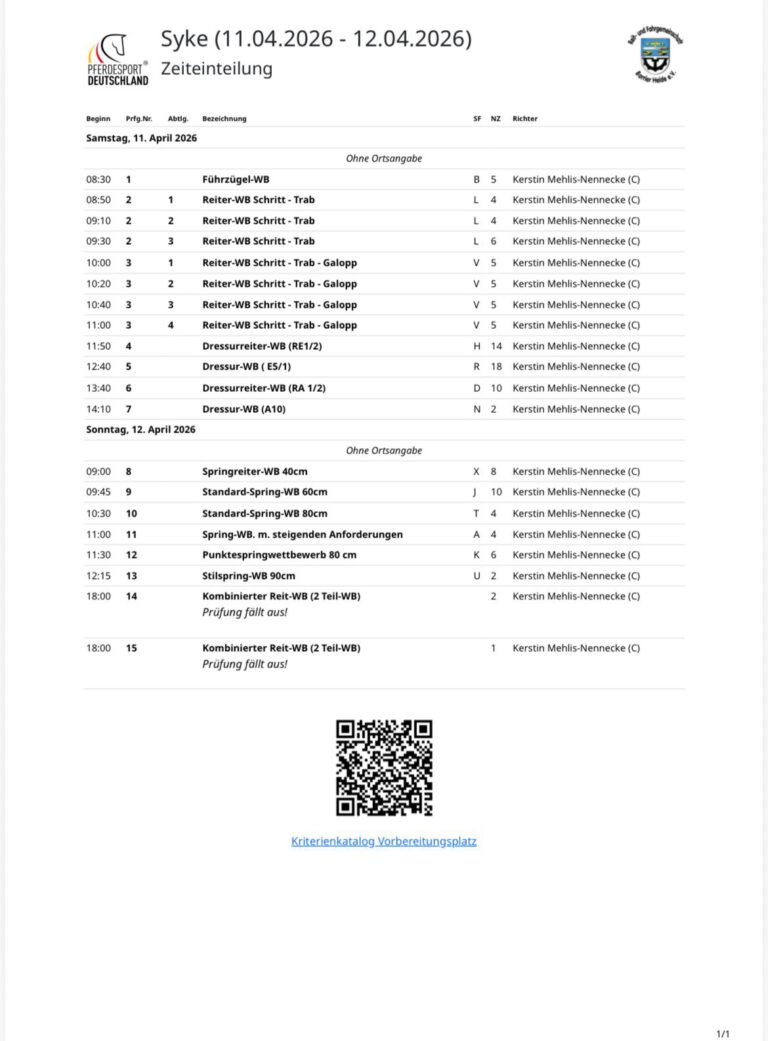 Schaut euch die aktuelle Zeiteinteilung für unser Turnier am Wochenende an. Wir freuen uns auf euch! Kriterienkatalog: https://www.pferd-aktuell.de/ausbildung/richter-und-parcourschefs/kriterienkatalog-vorbereitungsplatz